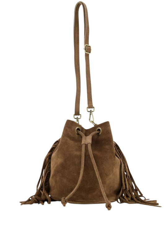 UitverkochtSuède Bucket Bag met Fringes – Bohemian Chic