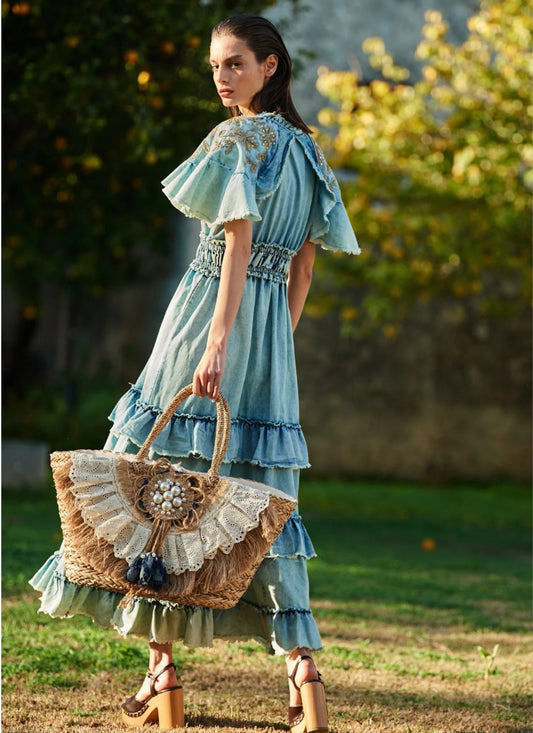 Boho Strandtasche mit Perlen und Spitzendetails – Handgemachte Raffia