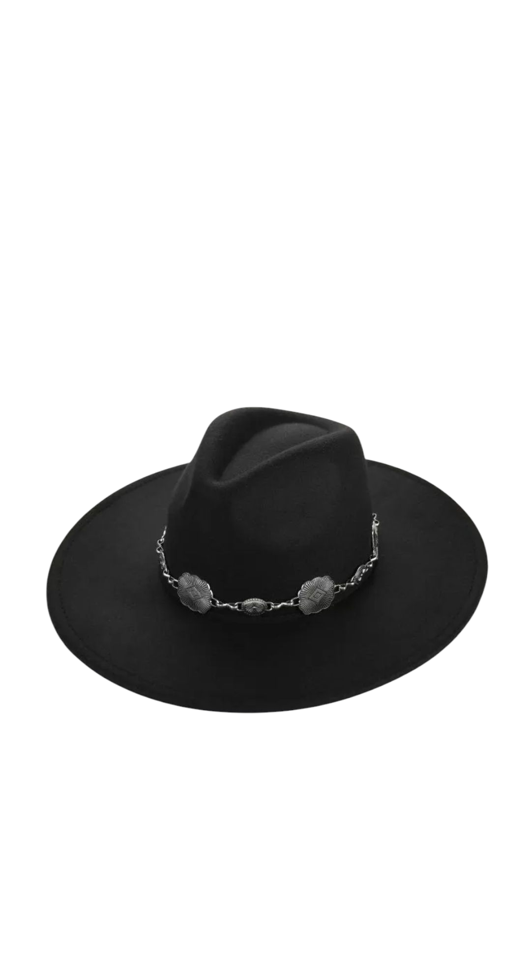 Schwarzer Hut mit silbernem Band. Der Hut hat eine Einheitsgröße, kann aber mit einer Kordel angepasst werden.