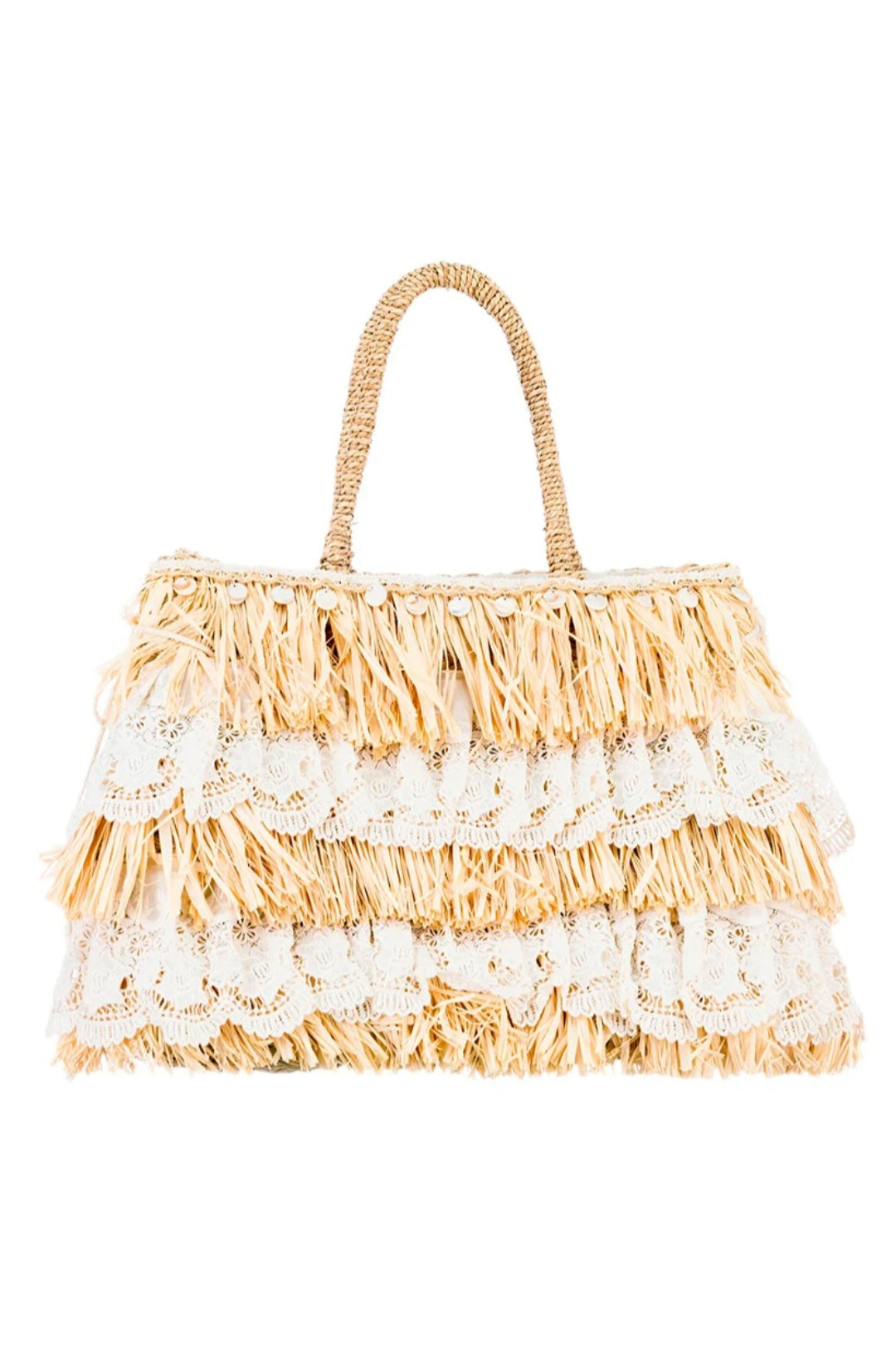 Bringen Sie Sommerstimmung mit dieser handgefertigten Basttasche! Sie ist mit verspielten Fransen aus natürlichem Bast, zarten , bestickten Spitzenstreifen und einem dezenten weißen Muschelbesatz verziert. Die stabilen Griffe sorgen für angenehmen Tragekomfort, und die großzügige Größe bietet viel Platz für alles Wichtige – von der Sonnenbrille über ein Buch bis hin zum Strandtuch.