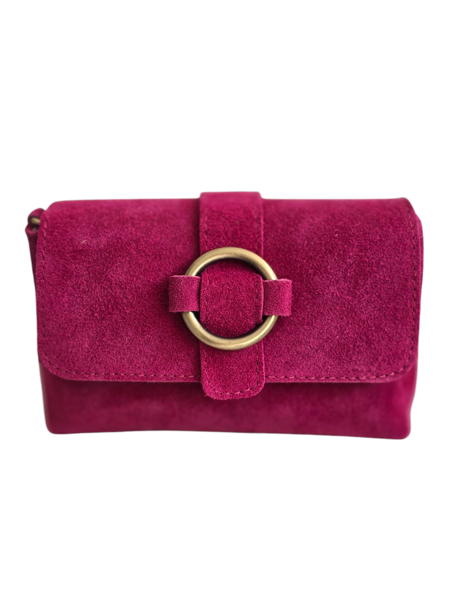 Diese rosafarbene Umhängetasche aus Wildleder verfügt über einen Magnetverschluss und einen verstellbaren Schultergurt aus Wildleder.