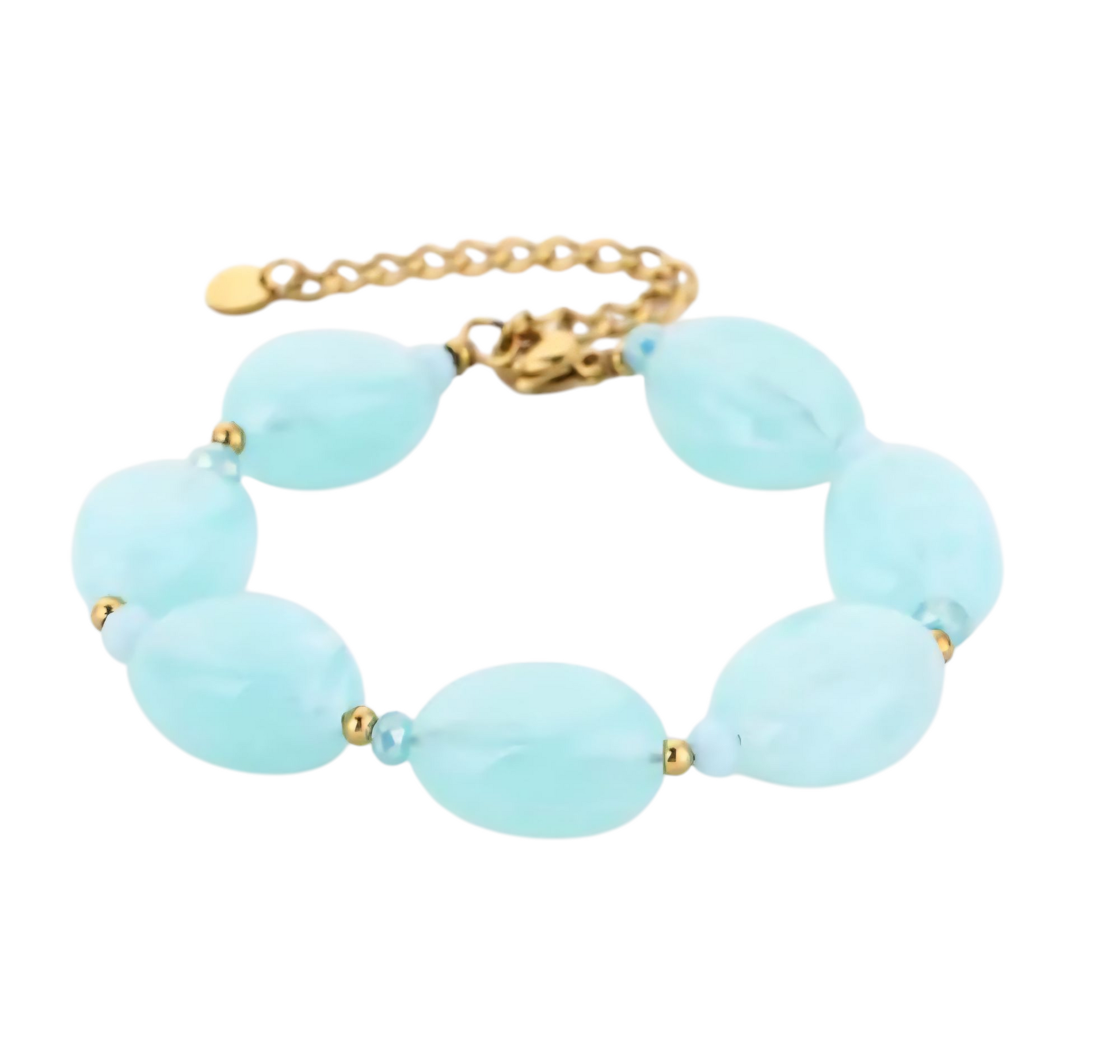 This stylish bracelet is a real eye-catcher thanks to the smooth, oval light blue stones that shimmer softly with every movement. The gold details create a chic contrast, making this bracelet perfect for both everyday wear and special occasions. Thanks to the adjustable clasp, it fits almost any wrist.