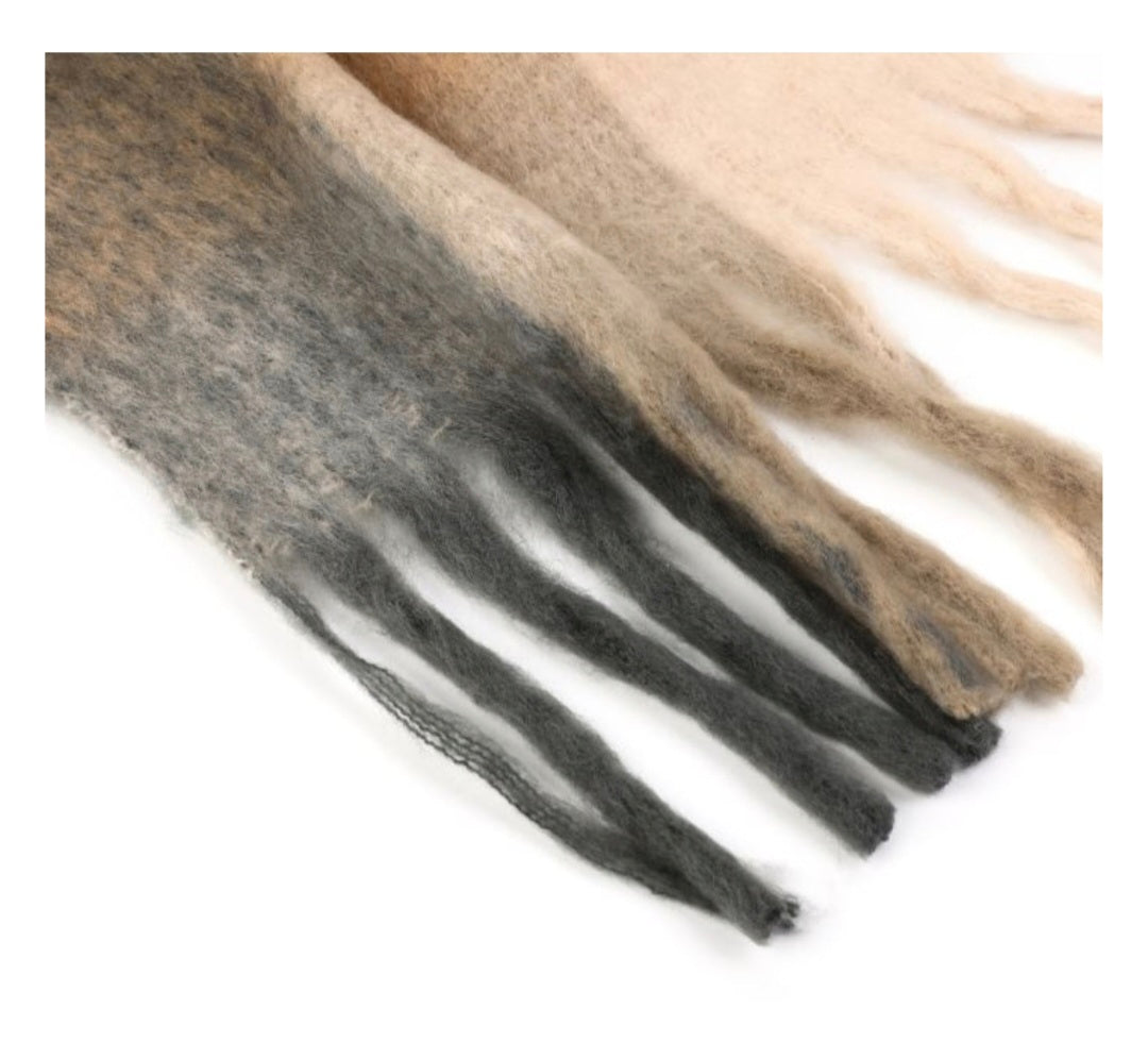 De Warm Ombre Shades sjaal combineert beige, camel en diepgrijs in een prachtig vervagend kleurverloop. De zachte, luchtige textuur zorgt voor ultiem draagcomfort, terwijl de franjes aan de uiteinden een speels accent toevoegen. Een stijlvolle favoriet voor de koelere dagen.